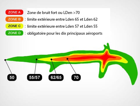 C’est à partir des prévisions de développement de l’activité aérienne (notamment du fret aérien en forte expansion) et de l’extension prévisible des infrastructures et des procédures de circulation aérienne, que le PEB définit des zones diversement exposées au bruit engendré par les aéronefs. On distingue des zones A et B, dites zones de bruit fort et des zones C et D dites zone de bruit modéré.